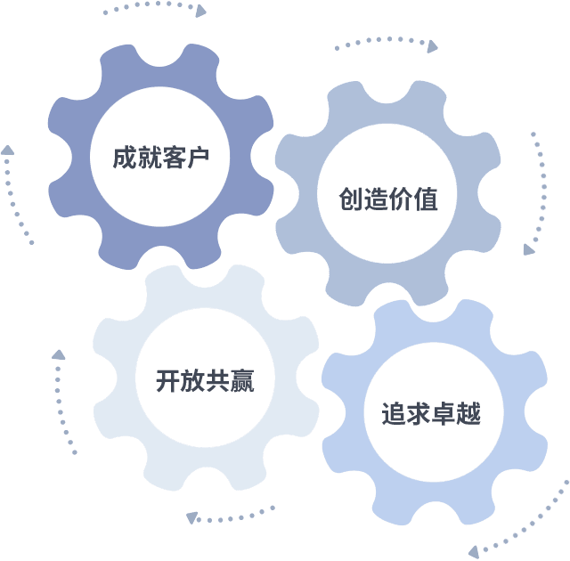 成就客户是一切决策的出发点,,,创造价值是衡量所有工作的标准,,,追求卓越是我们做事做人的态度,,,,开放共赢是我们的格局也是最终的结果。。。价值观的齿轮环环相扣,,,推动着组织里的每个人不断向前。。。。