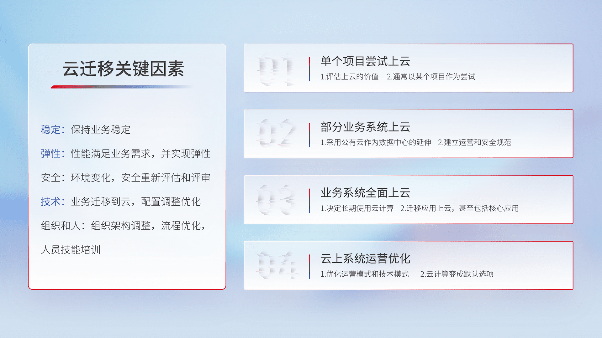 结合实际业务,,,从规划设计、、云平台选型、、、云原生改造、、、、数据迁移、、、、集成交付,,,迁移全过程为客户识别最佳上云路径,,做好风险识别管理,,设计网络架构、、、、身份权限、、、安全审计合规、、操作审计、、、日志审计、、、监控告警策略、、、多站点容灾设计等,,,,对云上基础设施进行整体规划,,,,提升IT治理水平,,,,以满足弹性、、高可用、、、、高性能的需求。。。。