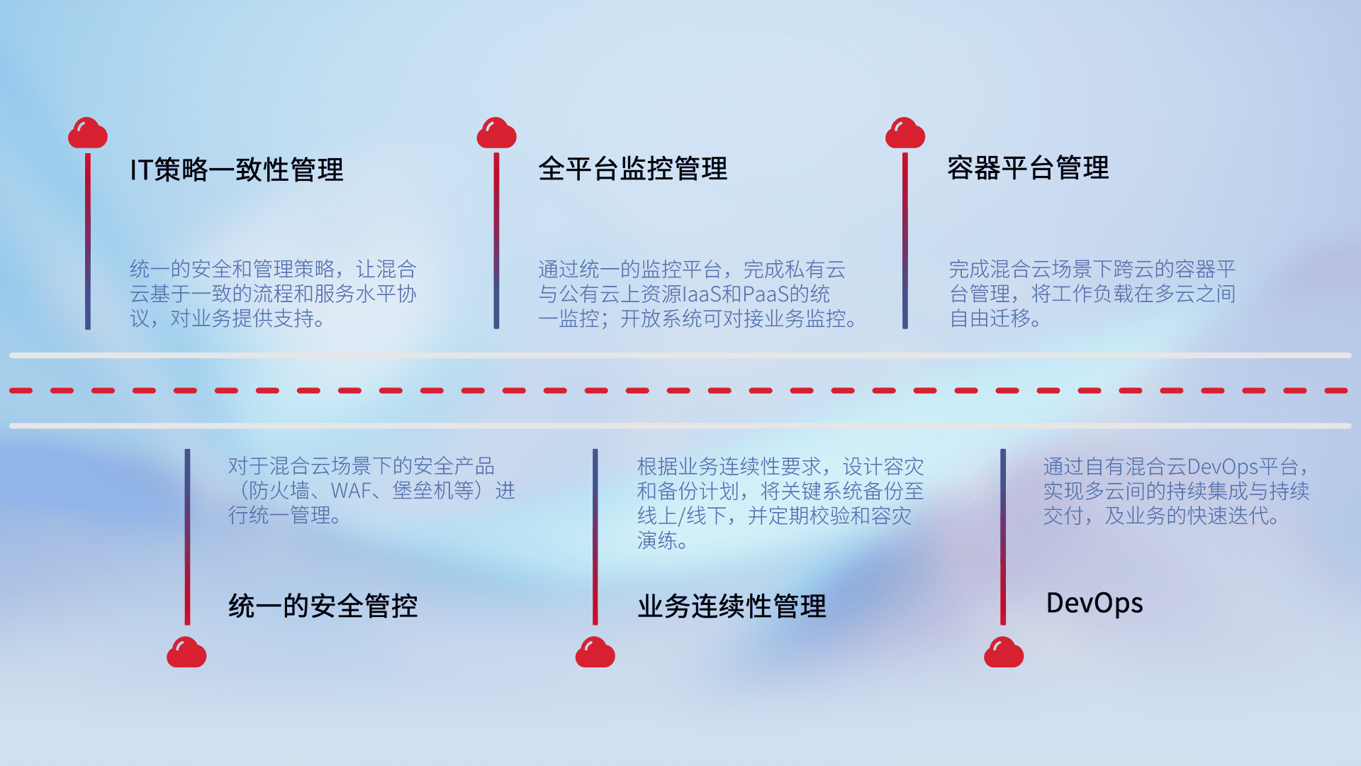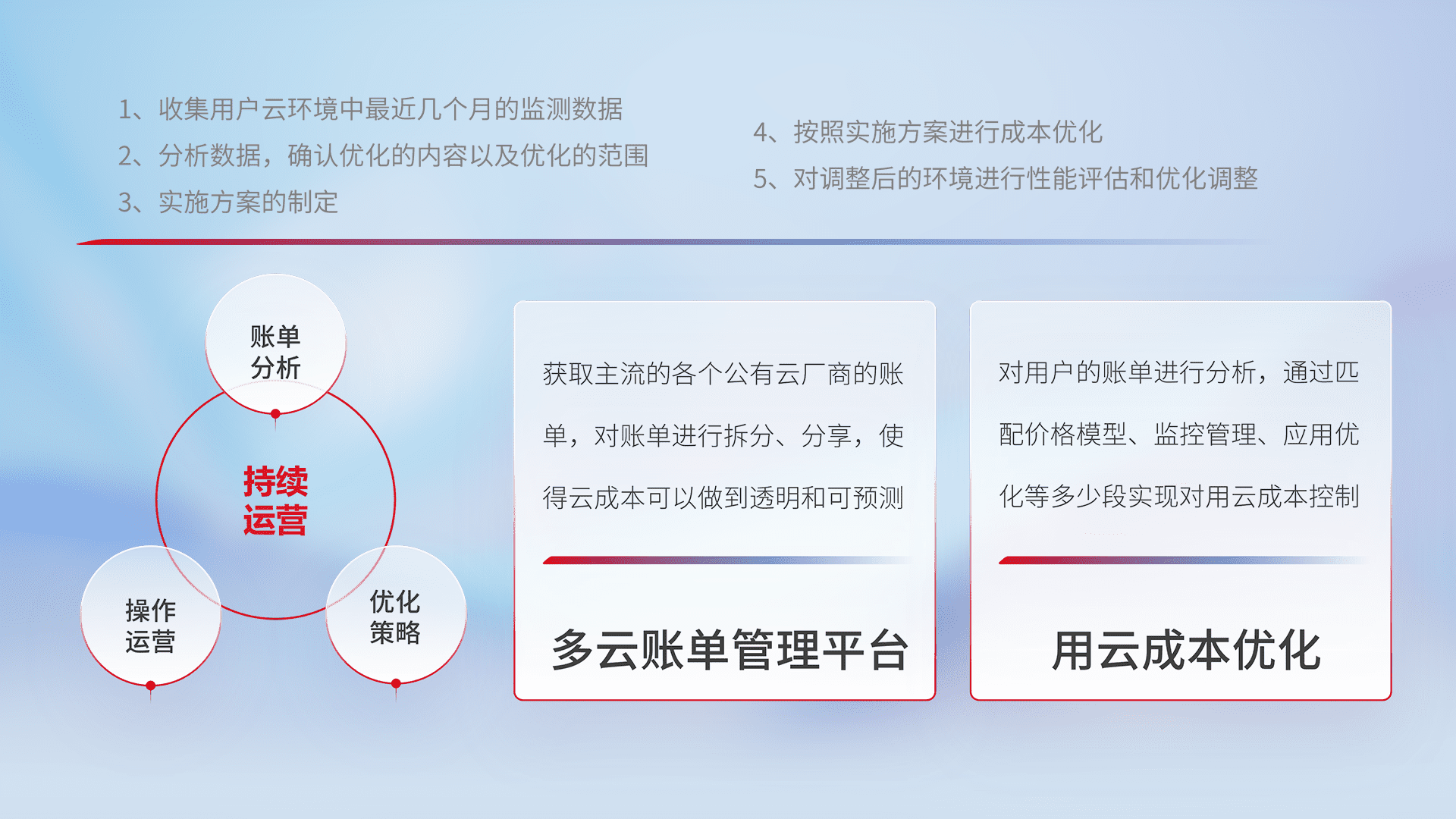 通过多云纳管,,,以统一的资源数据模型把客户的云资源进行抽象和封装,,进而实现对多云资源的统一操作,,,,保障云资源管理的可靠性、、稳定性与可用性。。。。量身定制化运维内容,,,,配置、、开发运维、、、补丁管理、、、备份、、、监控、、、认证和访问管理、、、审计和日常巡检等,,,,保障在用云过程中的可靠度,,稳定度以及高可用率。。。
