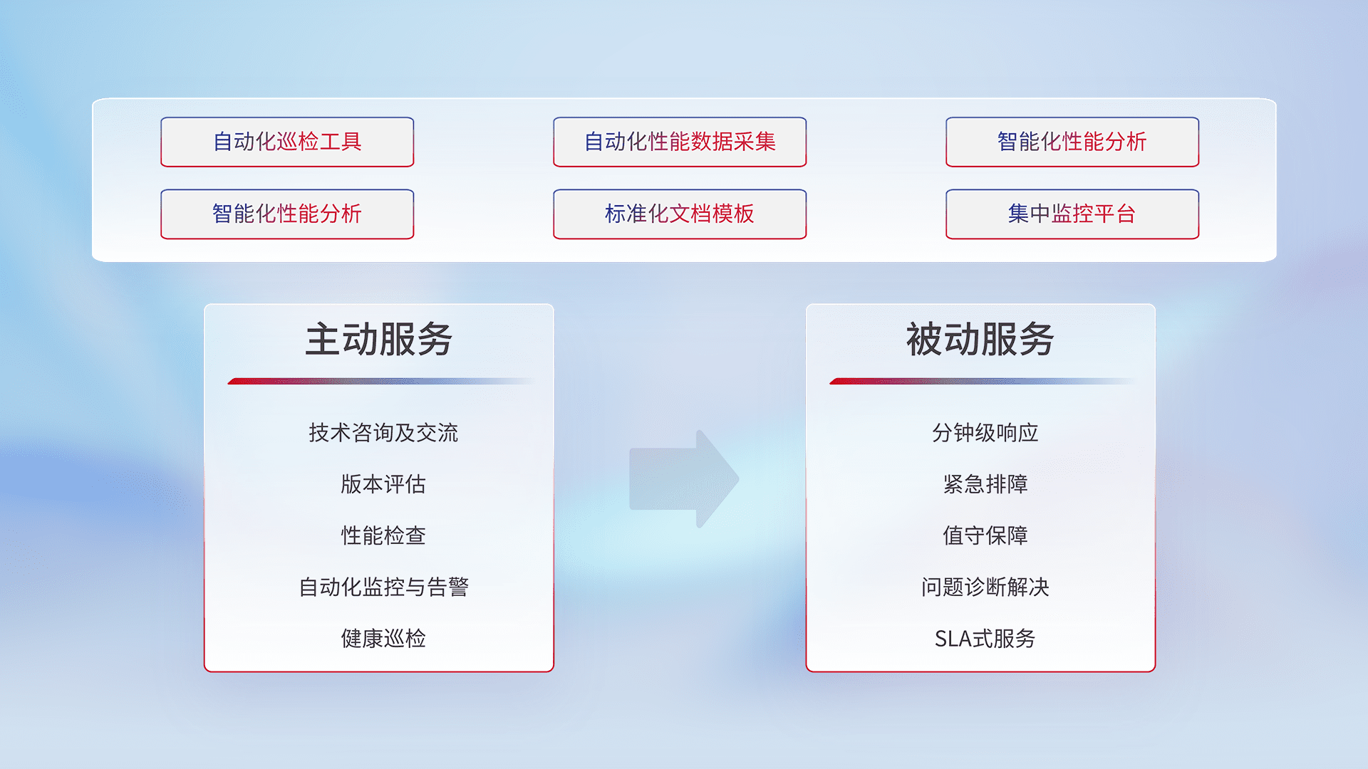 智能化工具和标准化文档,,保障服务质量,,,提供主动服务(包含技术咨询、、、版本评估、、、、性能检查、、自动化监控与告警、、健康巡检)和被动服务包含(分钟级响应、、、紧急排障、、值守保障、、、、问题诊断解决、、、SLA服务)。。